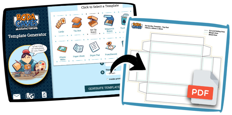 Boda Games has created a template generator to help you with your artwork files for your next board and card game. Our custom template generator can help you get custom sized templates for different components that fit exactly according to your artwork files.