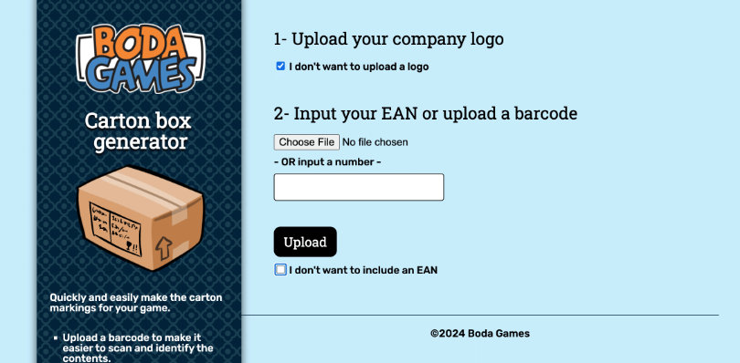 Quickly and easily make the carton markings for your game. With options for adding barcodes, your company and/or game logo and much more!