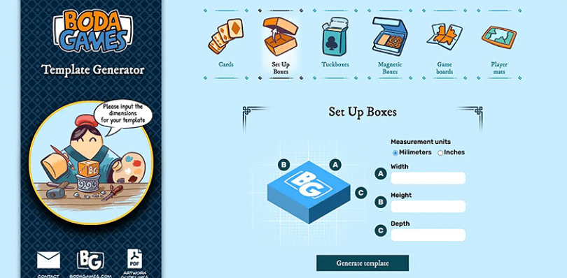 Boda Games has created a template generator to help you with your artwork files for your next board and card game. Our custom template generator can help you get custom sized templates that fit exactly according to your artwork files.